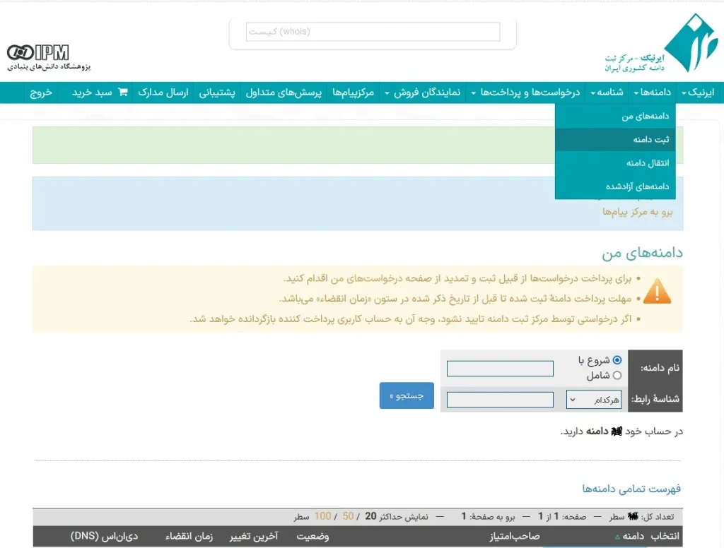 پس از پرداخت مبلغ حق ثبت، دامنه به صورت (در انتظار تایید واحد ثبت/ پرداخت شده) در لیست دامنه های من قرار خواهد گرفت و پس از تایید واحد ثبت متن ( ثبت شده) جلو آن درج خواهد گردید، البته در برخی از موارد قبل از تایید دامنه مستندات و یا مدارکی درخواست خواهد شد که به صورت ایمیل از مرکز ثبت اطلاع رسانی خواهد شد و نتیجه درخواست مدارک و یا ثبت نهایی نیز در قسمت پیام ها قابل مشاهده خواهد بود ضمنا در صورتی که تمایل به نگه داری از دامنه پس از مدت تمدید داشتیم میبایست دقت نمود که دامنه قبل از اتمام زمان پایان ثبت تمدید گردد و در غیر اینصورت یک ماه پس از اتمام مدت زمان تمدید از دسترس خارج خواهد شد.