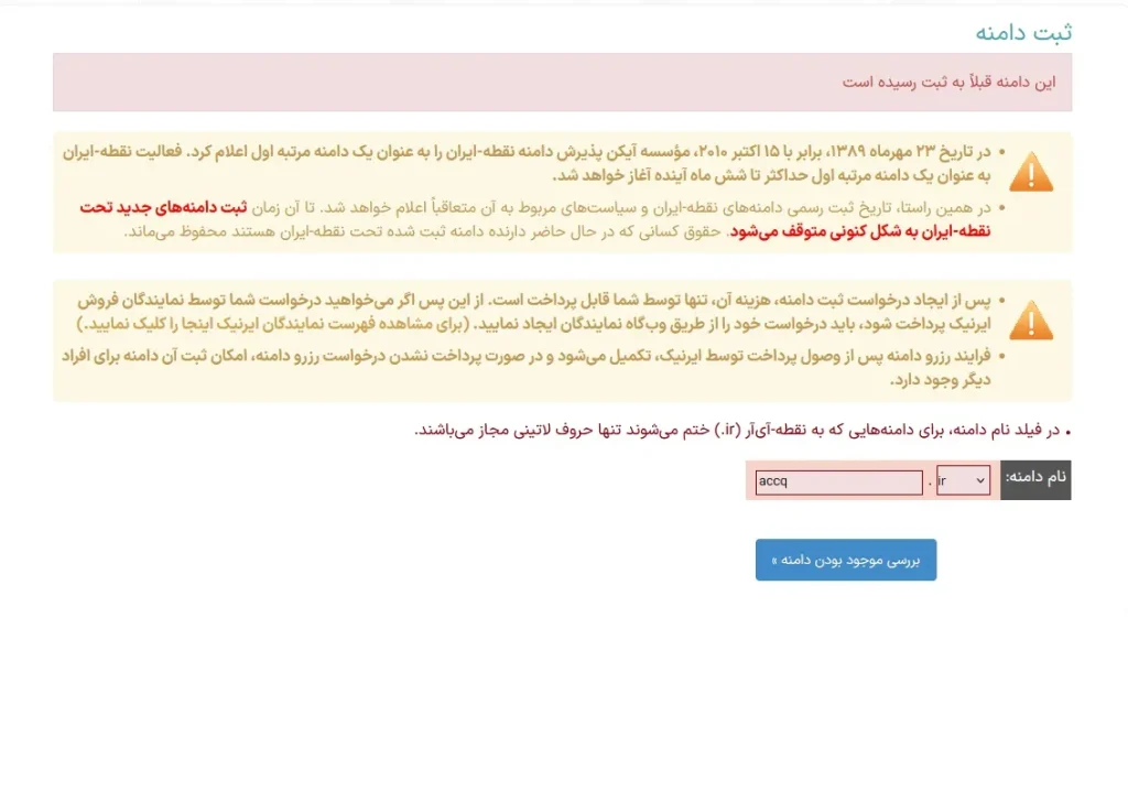 در صورتیکه دامنه قبلا توسط خودمان یا فرد دیگری ثبت شده باشد پیام زیر نمایش داده خواهد شد که در این صورت میبایست دامنه دیگری را جهت ثبت انتخاب نماییم