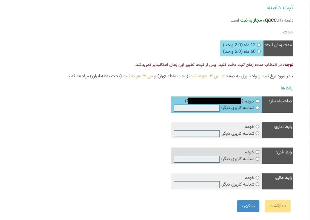 در صورتیکه دامنه جهت ثبت آزاد و قابل ثبت باشد پنجره بعد یعنی انتخاب مدت زمان ثبت و انتخاب رابط های دامنه نمایش داده خواهد شد