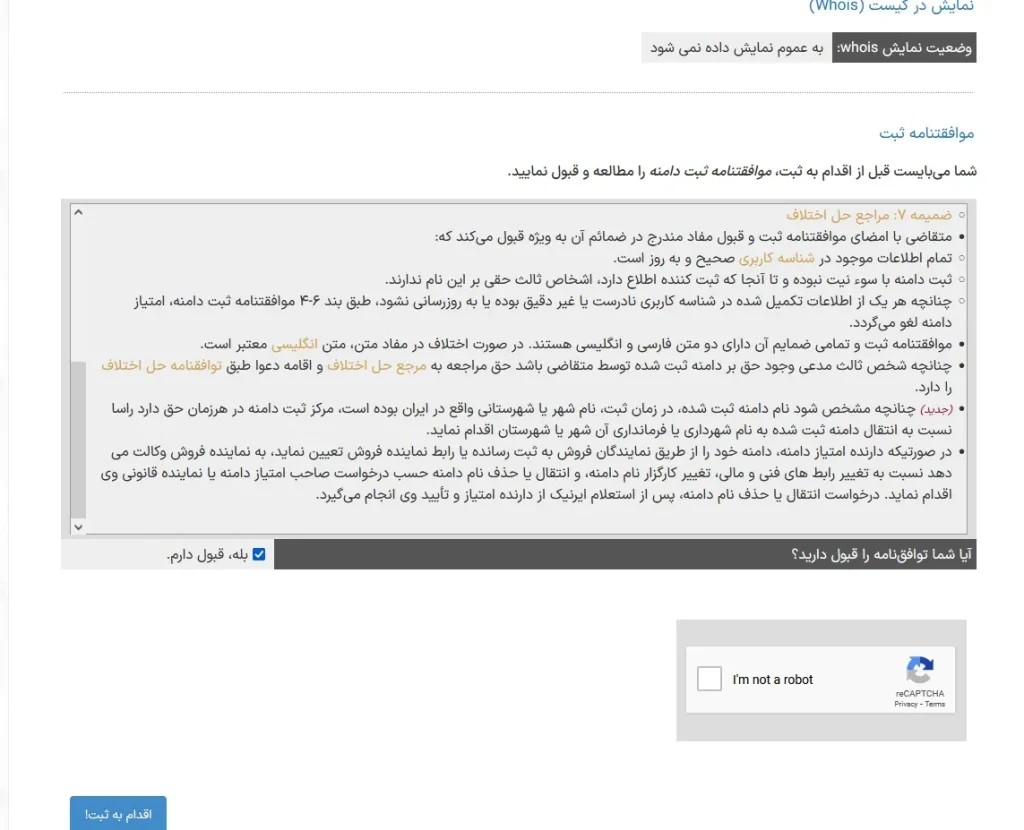 پس از تنظیمات فوق خلاصه ای از تنظیمات انجام شده جهت تایید نمایش داده خواهد شد که در صورت صحیح بودن و ضمن تایید قوانین ثبت دامنه که نمایش داده خواهد شد میتوانیم به مرحله بعد برویم .