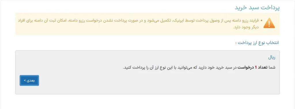 گزینه بعدی را کلیک و به مرحله آخر مراحل ثبتی سامانه و انتخاب نحوه پرداخت وارد میشویم