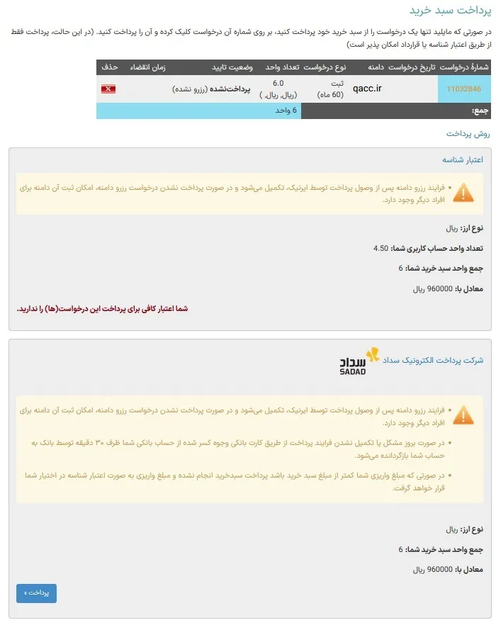 در صورتی که درشارژ حساب سامانه از قبل موجودی داشته باشیم، میتوانیم از آن محل تسویه حساب را انجام دهیم و در غیر این صورت میبایست جهت تکمیل مراحل پرداخت را انجام دهیم. توجه داشته باشید براساس مدت زمان انتخاب شده در زمان ثبت که دوره دوازده ماهه یا شصت ماهه میباشد مبلغ محاسبه شده جهت پرداخت درج خواهد شد.