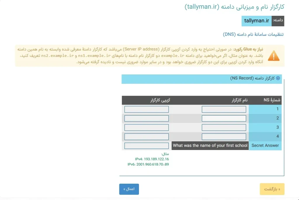 پس از ورود داده های درخواستی سوال امنیتی که در زمان تعریف شناسه کاربری مطرح نموده ایم را از ما سوال خواهد کرد و پس از درج جواب صحیح آی پی ها تعریف خواهد شد.